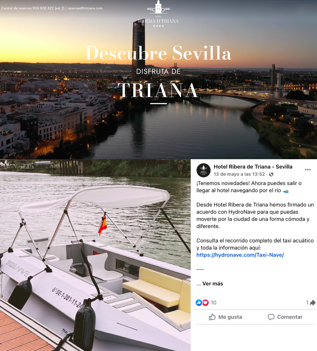 Acuerdo con HOTEL RIBERA DE TRIANA, el acuerdo firmado con el Hotel nos permite un flujo diario de pasajeros desde el Hotel al Centro. Un auténtico compromiso con la movilidad eficiente, sin emisiones y 100% eléctrica.